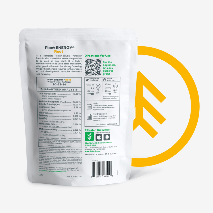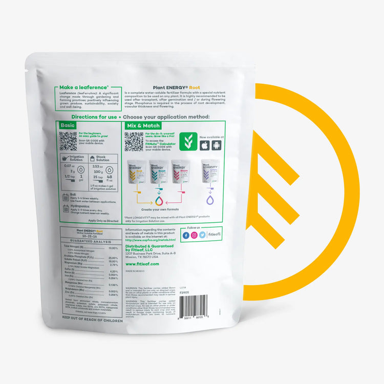 The Plant ENERGY® Root includes the following macro, micro and secondary nutrients in the proper ratios to both, 1) be applied directly under a 3-part fertilizer program as a Basic Application method, while remaining an integral component to coexist with the other Plant ENERGY® nutrient formulas to create crop and stage-specific formulas under the Mix & Match method.